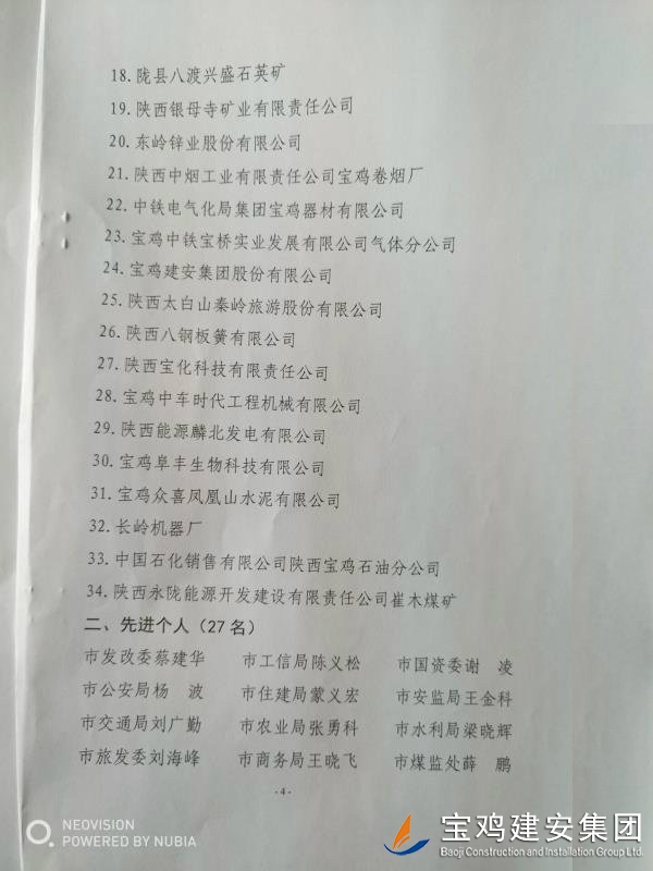 近期,寶雞市安委會對2017年度安全生產先進單位進行了通報,我單位在考核中以優異的成績獲得了此項殊榮。當然,取得這樣的成績,離不開各級領導的正確決策和基層單位的艱辛付出,公司安委會在此表示感謝。 2017年,公司始終圍繞在國家的大政方針框架下,積極展開以《安全生產法》及相關規范標準為核心的安全工作,堅持標本兼治、綜合治理、源頭管控,以遏制安全事故為重點,建立健全安全生產風險分級管控與隱患排查治理雙重機制,持續開展安全生產專項檢查,杜絕了惡性事故的發生。在安全生產標準化建設中,公司始終以“科技創新、合理投入、擇善而從”為出發點進行部署管理,通過系統管理及一系列舉措,使公司安全管理走在本土行業前列,且在多次檢查驗收中,獲得省、市級領導的點贊。 九牛一毫莫自夸 驕傲自滿必翻車,成績只代表過去,2018年,我們要完善不足,戒驕戒躁,砥礪前行。 寶雞建安集團股份有限公司安委會 2018年4月25日