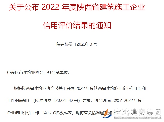 據(jù)悉,2022年度,參評企業(yè)范圍涵蓋了全省9個地市,涉及房建、市政、交通、鐵路等多個行業(yè)(專業(yè)),分布更加均衡,尤其是今年申報信用評價的企業(yè)數(shù)量創(chuàng)歷年來新高,企業(yè)參與度更加積極,競爭更加強(qiáng)烈。寶雞建安集團(tuán)股份有限公司再次獲得殊榮,首先來自于集團(tuán)領(lǐng)導(dǎo)的高度重視和指導(dǎo),其次與各部室通力協(xié)作密不可分,大家齊心協(xié)力,同心同德,不計得失,甘于奉獻(xiàn),充分展示了并肩協(xié)作的工作作風(fēng)。陜西省建筑施工企業(yè)信用AAA級榮譽(yù)的獲得,必將進(jìn)一步激發(fā)廣大員工追求卓越、勇攀高峰的拼搏精神,不斷為企業(yè)更快更好發(fā)展奉獻(xiàn)自身的智慧和力量!