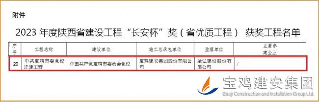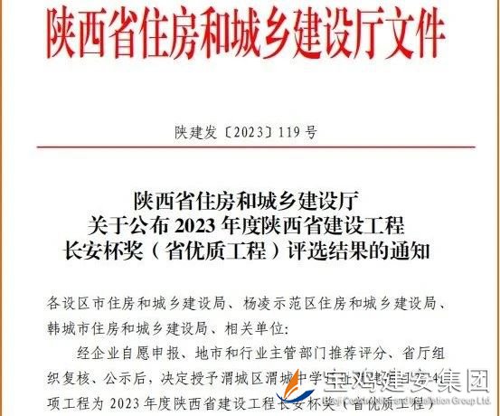 近日,陜西省住房和城鄉建設廳《關于公布2023年度陜西省建設工程長安杯獎(省優質工程)評選結果的通知》正式下發,公司承建的中共寶雞市委黨校遷建工程榮登金榜,為集團再添一項陜西省建設工程“長安杯”獎。