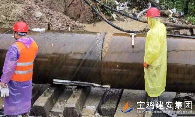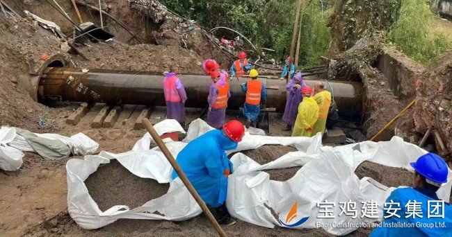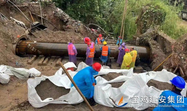 筑牢一線戰斗堡壘。“一個團隊就是一座戰斗堡壘、一名搶險者就是一面旗幟”。現場情況極端復雜,雨水管道直徑1.6米,爆管距離9.32米,水流湍急,形勢險峻。經我單位同市政公司反復溝通,最終確定了較為科學的搶修方案:在水泥管中間穿12米長鋼管,采用中間焊接兩端包口的方式進行連接……